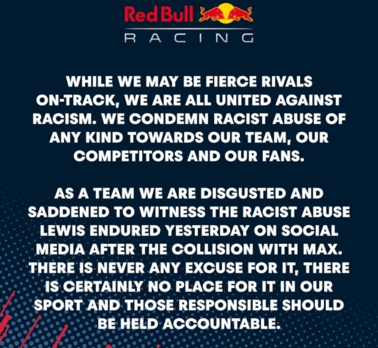 Red Bull emitió además una declaración en la que criticó los ataques a Hamilton.