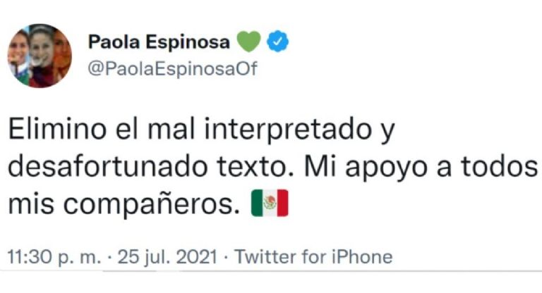 Elimino el mal interpretado y desafortunado texto. Mi apoyo a todos mis compañeros", expresó por su cuenta oficial de Twitter la atleta mexicana.