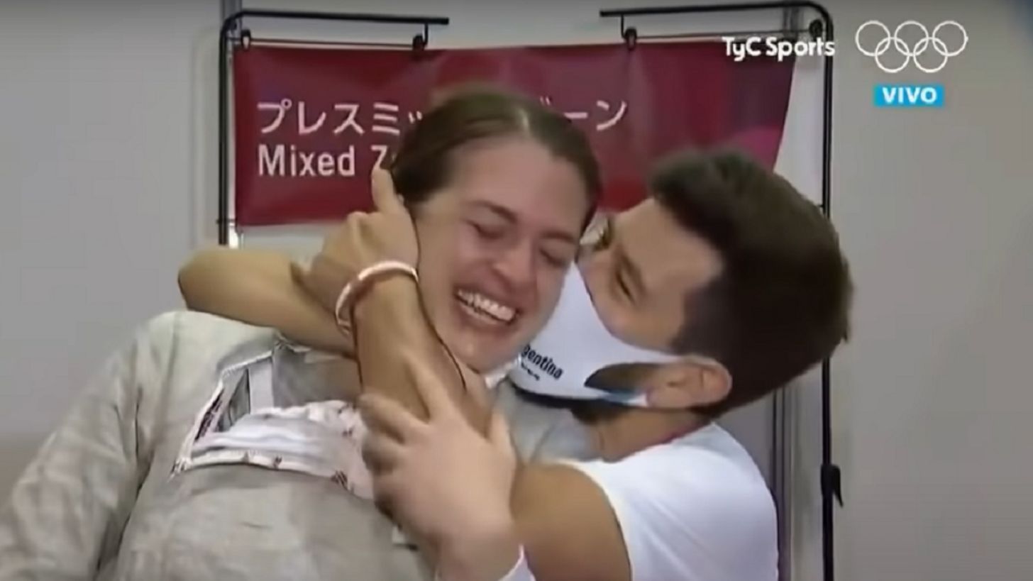 Luego de caer eliminada en la prueba de sable, la deportista acudió a la zona mixta para declarar, y al momento de encontrarse hablando, por detrás apareció su novio y entrenador Lucas Saucedo.
