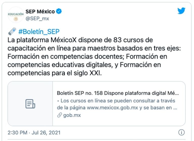 La Secretaría de Educación Pública (SEP) habilitó la plataforma de capacitación para maestros MéxicoX, con 83 cursos en línea, a los que se puede ingresar a través del siguiente enlace oficial (www.mexicox.gob.mx).