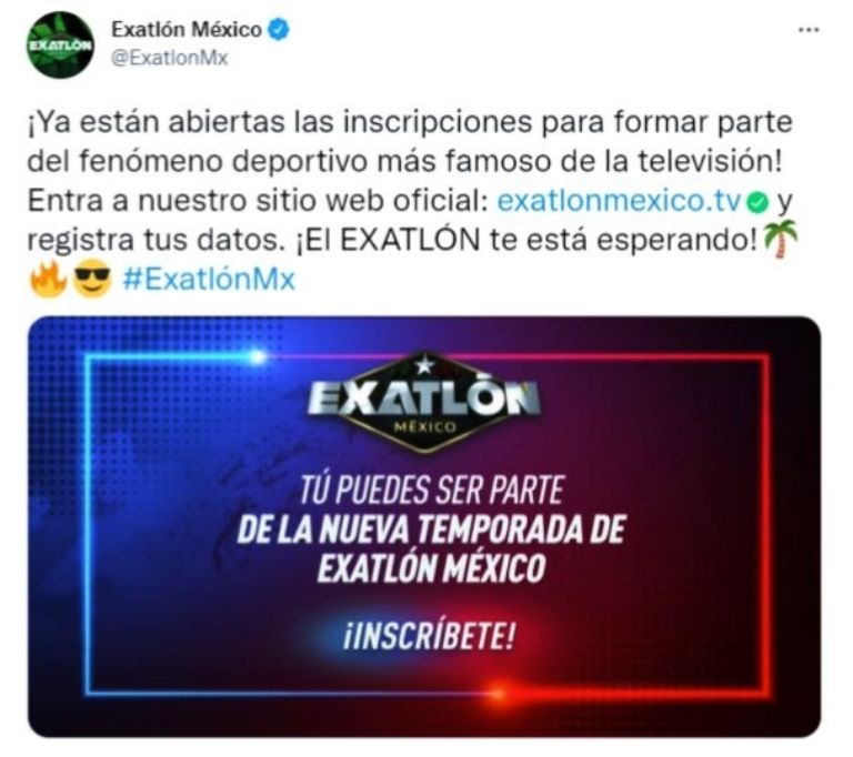 ¡Ya están abiertas las inscripciones para formar parte del fenómeno deportivo más famoso de la televisión! Entra a nuestro sitio web oficial: http://exatlonmexico.tv y registra tus datos. ¡El EXATLÓN te está esperando!", se lee en la publicación.