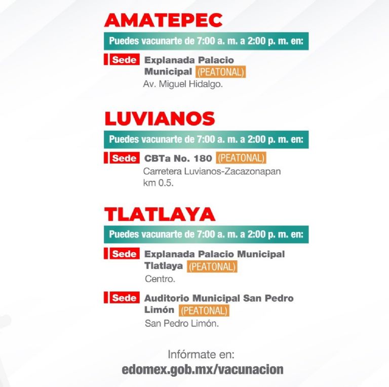 En el Estado de México también se vacunará a este último rango de edad en cuatro municipios: Amatepec, Tejupilco, Tlatlaya y Luvianos, a partir de este 5 de julio.