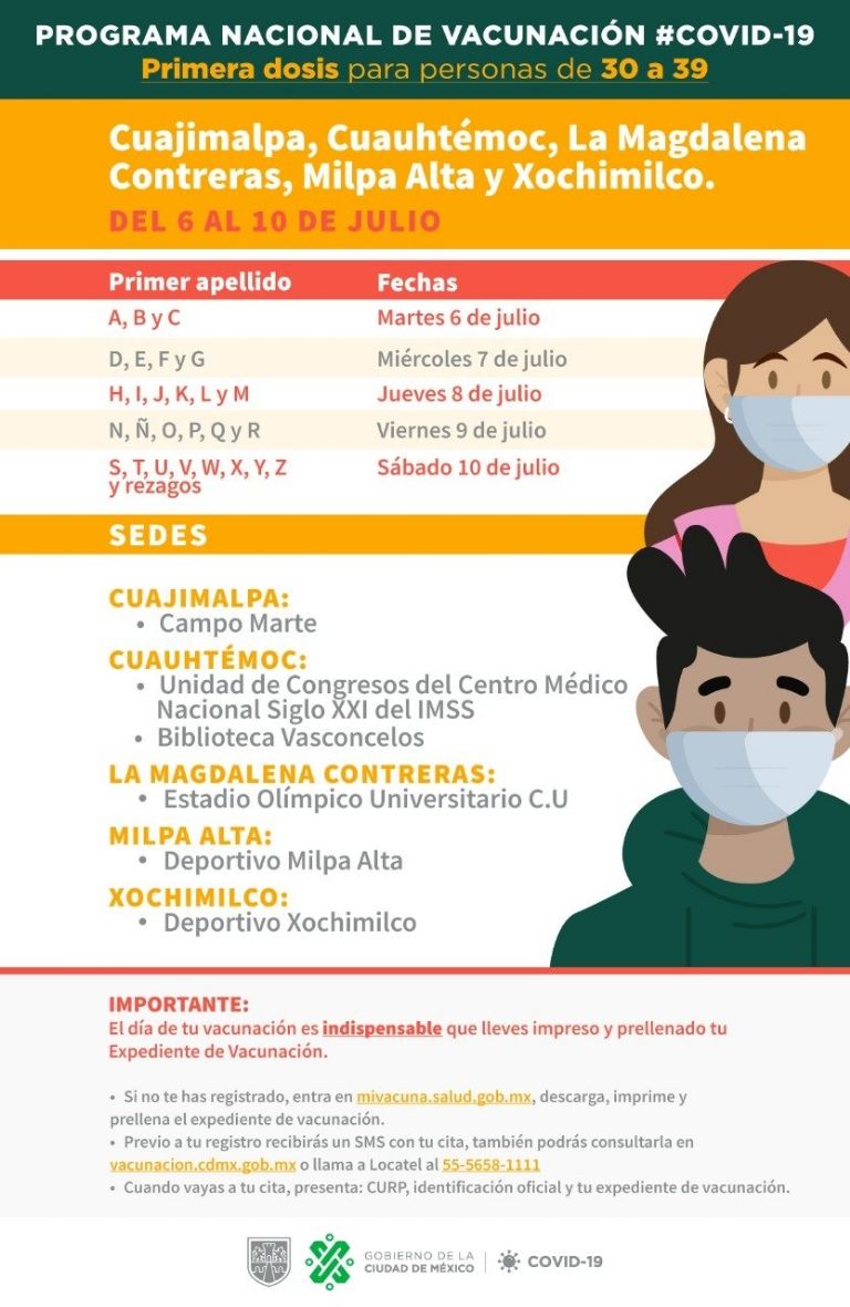 Continúa la campaña de vacunación contra el Covid-19 en la Ciudad de México, en distintas alcaldías y para distintos rangos de edad. Esta semana se abrirá un nuevo rango, que será el de 30 a 39 años en cinco demarcaciones de la capital, mientras continúan con las primeras y segundas dosis para edades que ya habían iniciado el proceso.