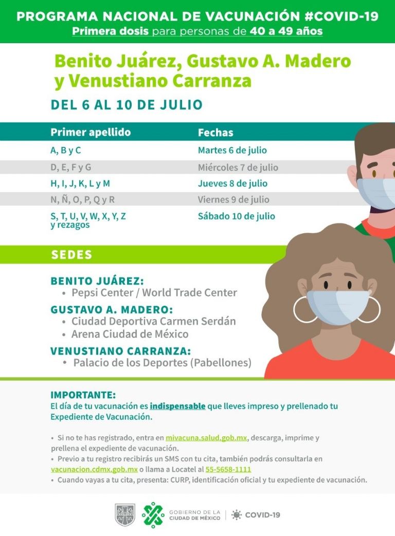 Al mismo tiempo, se aplicará la vacuna a los adultos que entren en el rango de edad de entre 40 y 49 años, para quienes vivan en las alcaldías Benito Juárez, Gustavo A. Madero y Venustiano Carranza.