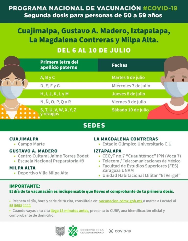 El gobierno de la CDMX informó que se suministrará la segunda dosis de la vacuna a las personas de 50 a 59 años en cinco aldaldías: Cuajimalpa, Gustavo A. Madero, Iztapalapa, Magdalena Contreras y Milpa Alta.