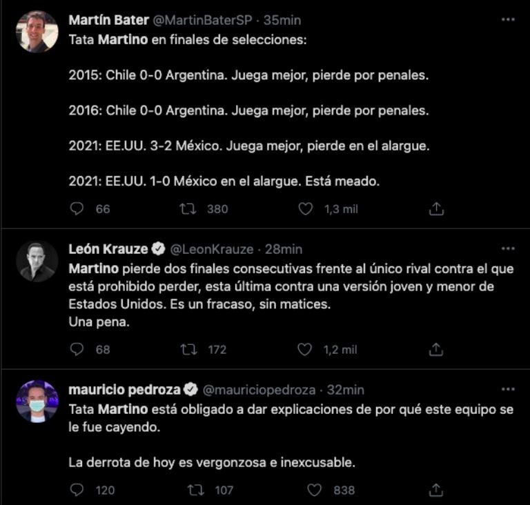 En Las Vegas, el cimbronazo del Tricolor provocó reacciones de los aficionados en contra de Martino y compañía. Las principales críticas en redes sociales, que en días como éste son un termómetro del estado anímico de los usuarios, apuntaron a sus últimas convocatorias como seleccionador.