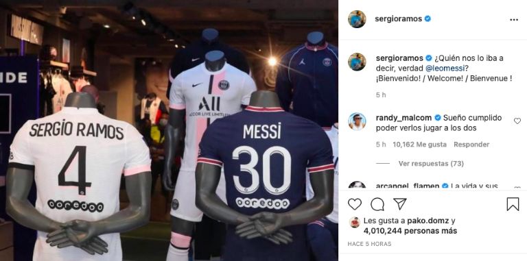 Ramos, de 35 años, compartió la foto de una tienda del PSG en la que aparecen dos camisetas, una con el 4 de Ramos y otra con el 30 de Messi. Ambas elásticas del PSG.