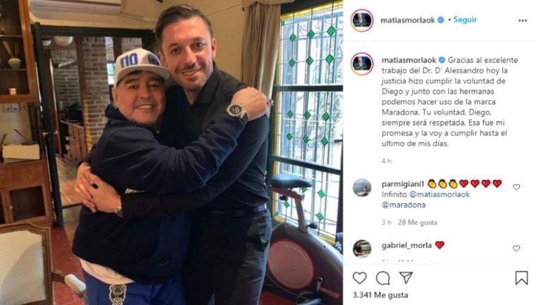 Gracias al excelente trabajo del Dr. D’ Alessandro hoy la justicia hizo cumplir la voluntad de Diego y junto con las hermanas podemos hacer uso de la marca Maradona. Tu voluntad, Diego, siempre será respetada. Esa fue mi promesa y la voy a cumplir hasta el ultimo de mis días", escribió Morla en sus redes sociales junto a una foto con Diego Armando Maradona.
