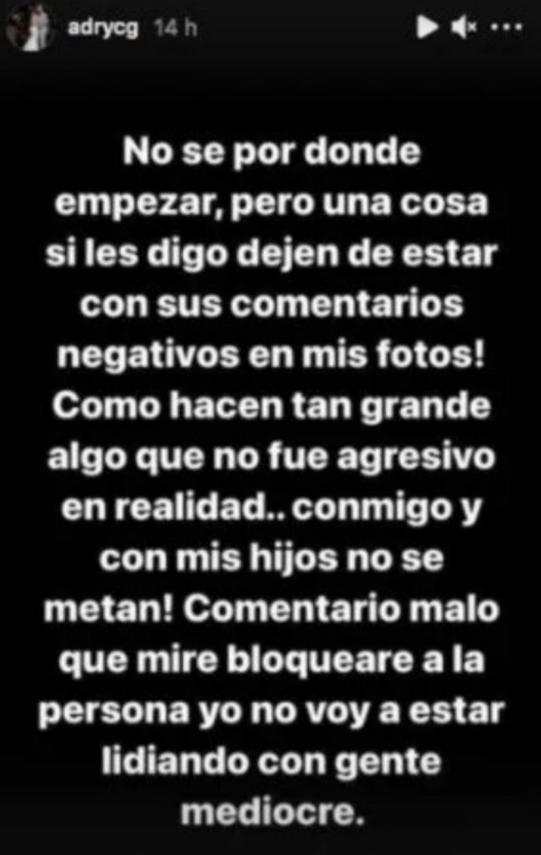 “¡Dejen de estar con sus comentarios negativos en mis fotos! Cómo hacen tan grande que no fue agresivo en realidad ¡Conmigo y mis hijos no se metan!”, escribió molesta.