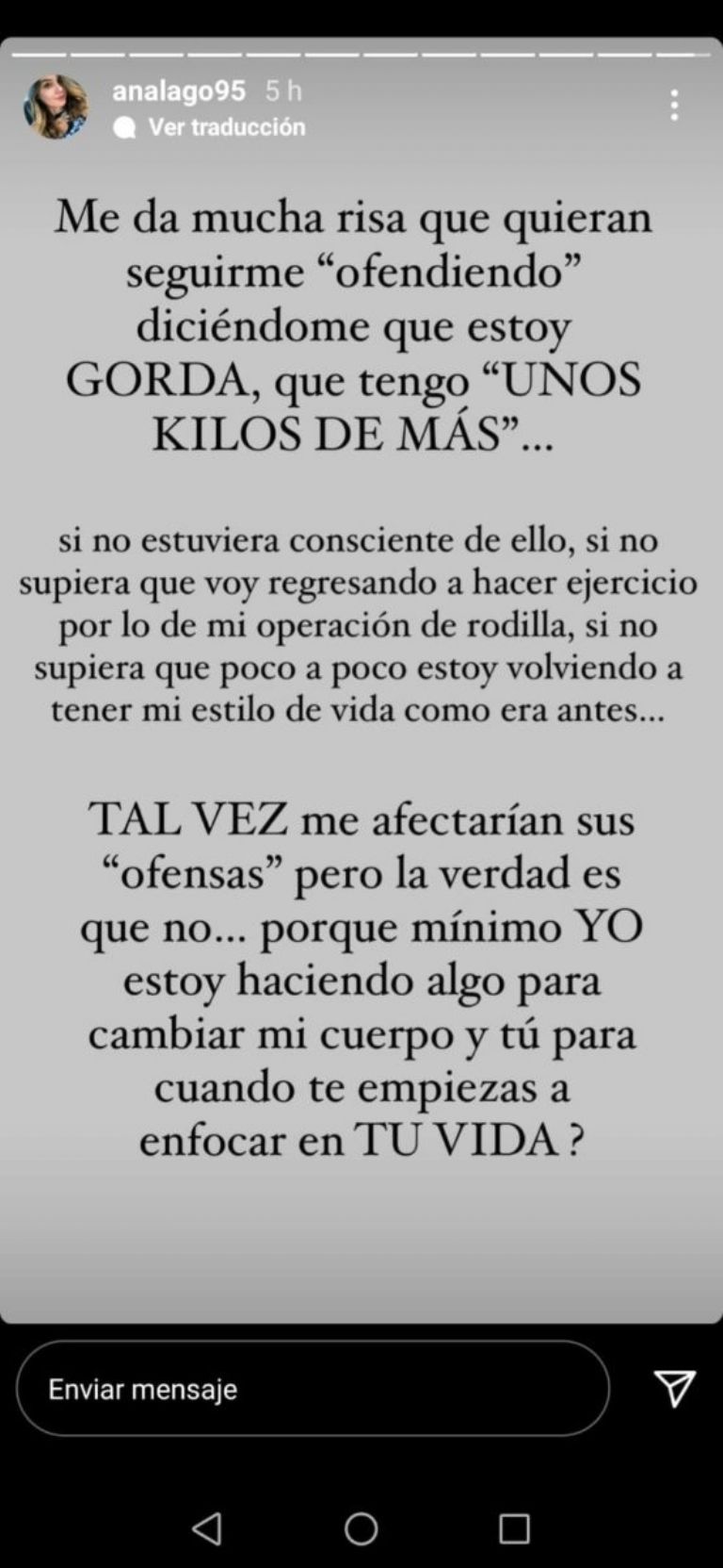 "Me da mucha risa que quieran seguirme “ofendiendo” diciéndome que estoy GORDA, que tengo “UNOS KILOS DE MÁS”… Si no estuviera consciente de ello, si no supiera que voy regresando a hacer ejercicio por lo de mi operación de rodilla, si no supiera que poco a poco estoy volviendo a tener mi estilo de vida como eran antes”, escribió Ana Lago.
