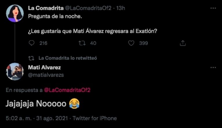 La sola mención de Mati provocó miles de reacciones entre los seguidores del sitio, pidiendo el retorno de la “Golden Champion” a los circuitos de la quinta temporada.