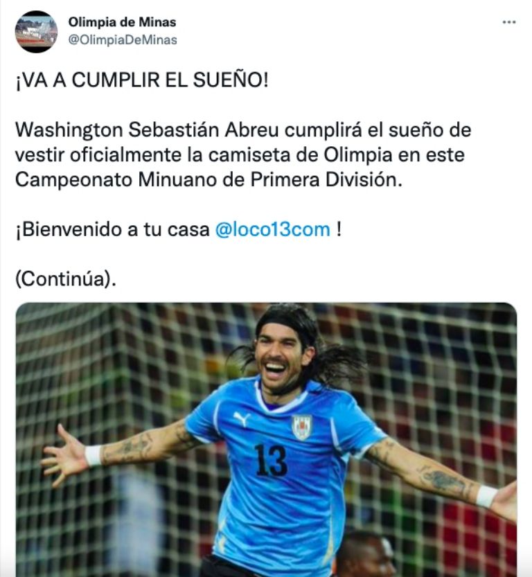 "Va a cumplir el sueño. Washington Sebastián Abreu cumplirá el sueño de vestir oficialmente la camiseta de Olimpia en este Campeonato Minuano de Primera División. ¡Bienvenido a tu casa, Loco!", anunció Olimpia en sus redes sociales.