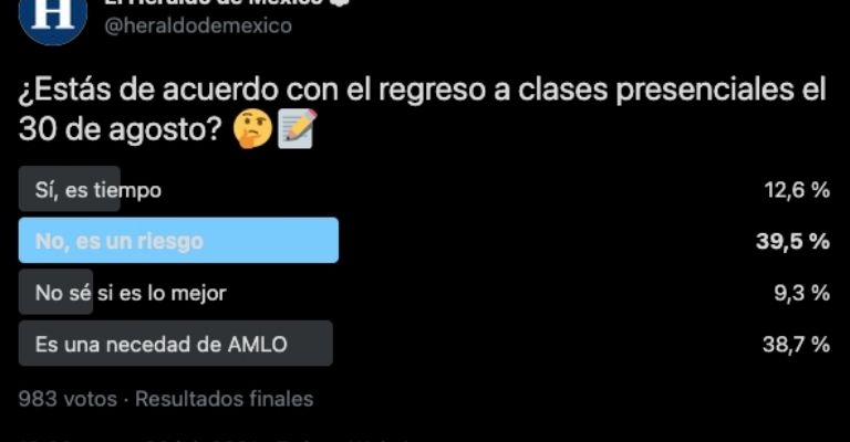 Por ello, El Heraldo de México, a través de su cuenta oficial de Twitter, lanzó la siguiente encuesta para conocer la opinión de sus seguidores ante la proximidad del regreso a clases para el Ciclo Escolar 2021 - 2022: "¿Estás de acuerdo con el regreso a clases presenciales el 30 de agosto?"