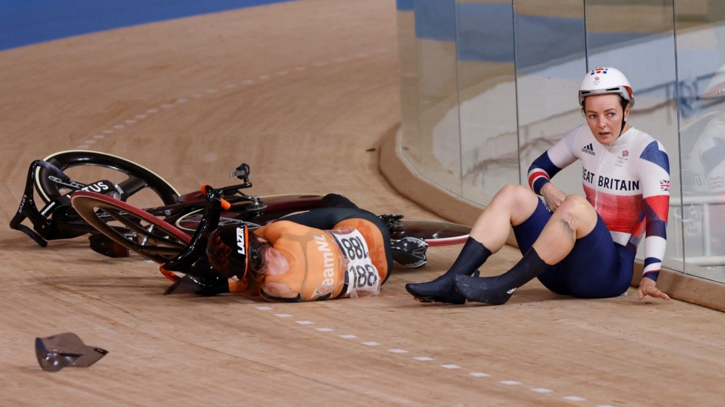 La holandesa Laurine van Riessen chocó contra el volante de la británica Katy Marchant y cayó con fuerza contra el suelo, durante su eliminatoria Sprint en los Juegos Olímpicos de Tokio 2020.