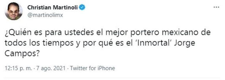 Y Christian Martinoli se sumó a la discusión, aunque no eligió a ninguno de los dos mencionados, sino que en un tweet reveló su postura y se decantó por Jorge Campos.