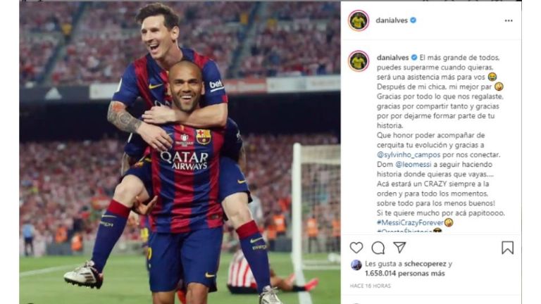 Gracias por todo lo que nos regalaste, gracias por compartir tanto y gracias por por dejarme formar parte de tu historia. Que honor poder acompañar de cerquita tu evolución y gracias a @sylvinho_campos por conectarnos. Don @leomessi a seguir haciendo historia donde quieras que vayas…. Acá estará un CRAZY siempre a la orden y para todo los momentos, sobre todo para los menos buenos! Si te quiere mucho por acá papitoooo", finalizó Alves.