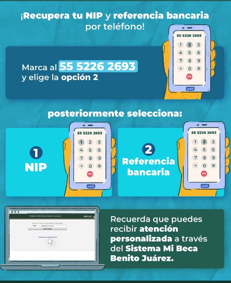 El proceso se debe realizar a través del teléfono con el que fue registrado al momento de solicitar la beca, así será más fácil de realizar el trámite. Si el dinero de la beca es retirado a través de los cajeros de BBVA, puedes marcar al número 55-52—26-26-93, cuando te contesten y te den las opciones del mení, elige el número 2, posteriormente elige la opción1 que es la del NIP y después el número 2 que es la referencia bancaria. Con estos pasos podrás tener de nuevo tu referencia bancaria y así poder cobrar la Beca Benito Juárez.