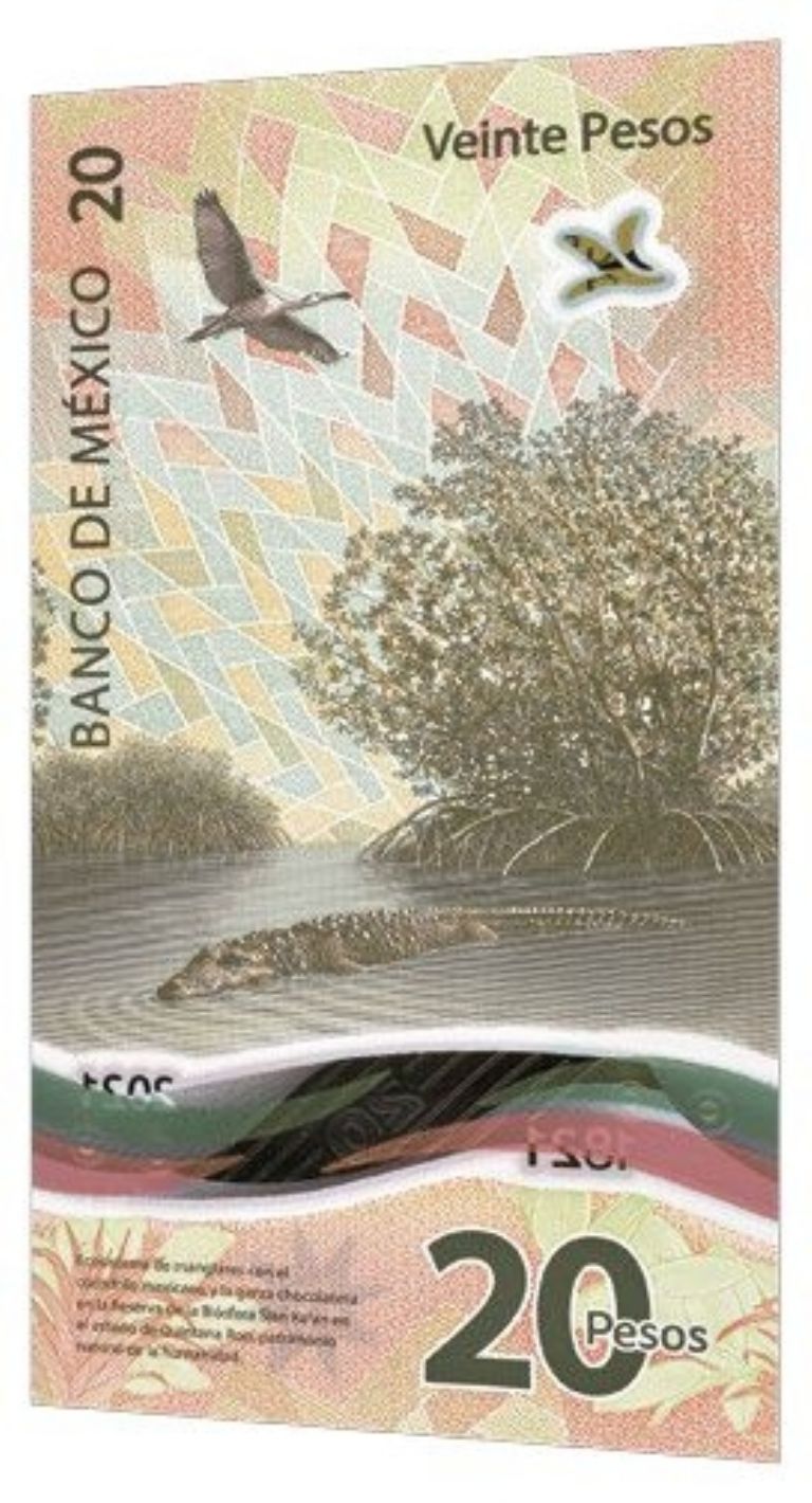 En el reverso de la nota bancaria hay imágenes del ecosistema de manglares, con algunos animales como el cocodrilo mexicano y la garza chocolatera, en la Reserva de Biósfera Sian Ka’an ubicada en el estado de Quintana Roo (muy cerca de Tulum).