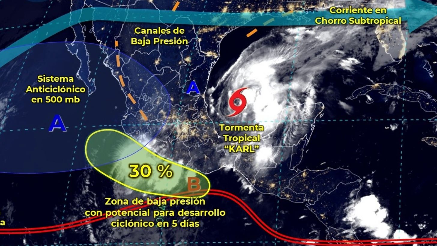 El viernes, Karl se moverá hacia el sur provocando lluvias intensas en Veracruz, Chiapas y Tabasco y muy fuertes en Oaxaca, Yucatán, Campeche y Puebla, con chubascos en el centro y sur del territorio nacional por una baja presión al sur de las costas de Guerrero y Michoacán.