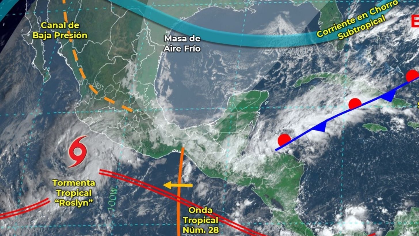 El Servicio Meteorológico Nacional informó que este sábado y domingo se esperan lluvias torrenciales e intensas debido a que el ciclón tropical Roslyn, que se moverá junto con un canal de baja presión con descargas eléctricas sobre estados de la Sierra Madre Occidental y el centro del país.