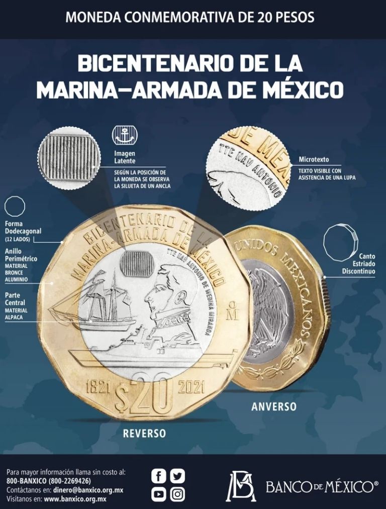 El Banco de México puso en circulación la nueva moneda de 20 pesos conmemorativa del Bicentenario de la Marina-Armada de México a partir de este 4 de octubre, por lo que a partir de ahora podrás recibirla para hacer cualquier transacción comercial.