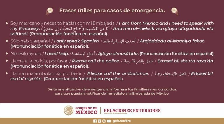 Ante ello, la SRE compartió una lista de frases y enunciados en tres idiomas en caso de requerir un llamado de emergencia, que serán de mucha utilidad y recomienda a tener cerca, durante algún siniestro o situación fuera de control.