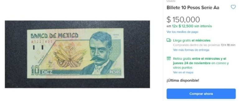 Por estos puntos, el dueño de este billete lo puso a disposición de las y los coleccionistas en Mercado Libre a través de un precio cercano a los 150 mil pesos, aunque este varía en función de quien lo esté ofertando. Eso así, el dueño de mismo no esclarece las razones por las cuales colocó un costo tan abundante, el cual es prácticamente imposible para muchas personas.
