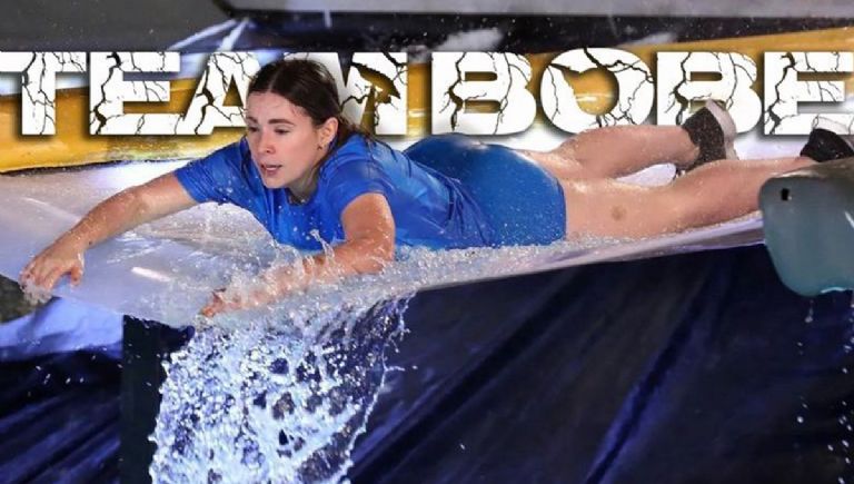 De León estaba corriendo el Circuito Submarino, pero en la piscina con espuma se puso nerviosa y tuvo algunos problemas para salir de la alberca. Lobito no dudo en meterse en auxilio de hoy su amada.
