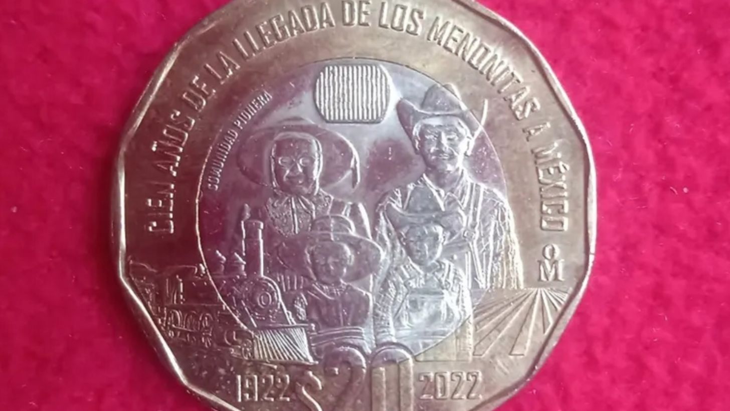 Se trata de una pieza que fue lanzada apenas el pasado 8 de agosto, bimetálica y de la familia C1, conmemorativa de los 100 años de la llegada de los menonitas a nuestro país y que tiene un diseño hermoso, con la imagen al frente y al centro de una familia perteneciente a la rama pacifista y trinitaria del movimiento cristiano anabaptista, mientras que en la parte inferior izquierda muestra un tren y a la derecha un campo arado.