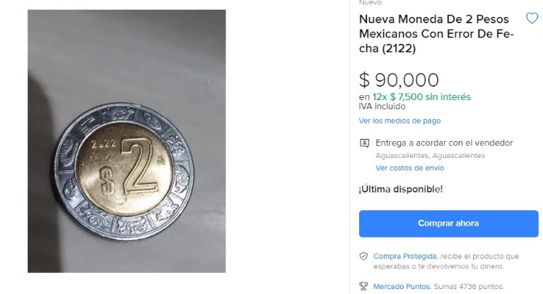 Por este simple error es que el propietario coloca la moneda de 2 pesos en un monto de 90 mil pesos; es decir, casi 100 mil pesos, una cantidad que pocas personas podrían costear. De igual forma, establece que la misma se encuentra en perfectas condiciones y que está hecha de níquel, aunque descarta que esta sea un objeto conmemorativo.
