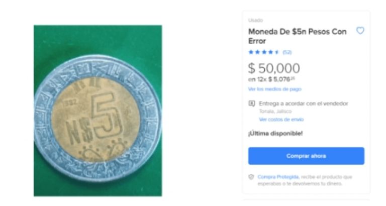 Mercado Libre, plataforma experta en ofrecer objetos de esta índole, fue la escogida por un usuario que cuenta con la moneda de 5 pesos y que la ofrece hasta en 50 mil por un error que tiene en su año, la cual la hace realmente interesante para las y los coleccionistas que buscan estas deficiencias a fin de hacer de su colección una sin precedentes.