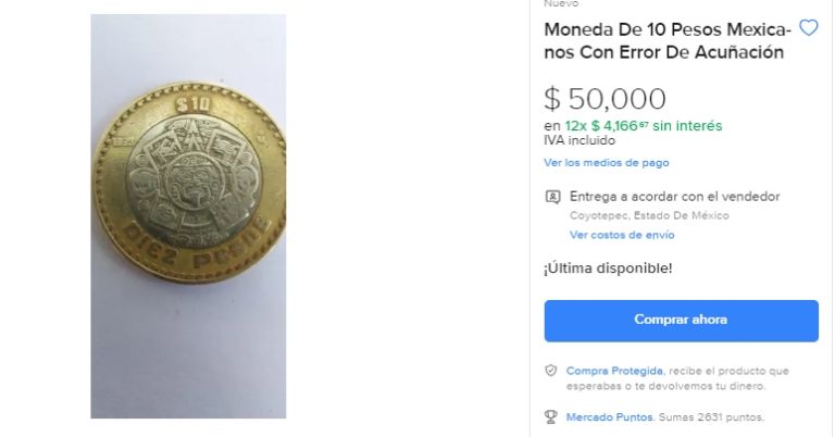 Para ejemplo de lo anterior está la moneda de 10 pesos que, según su dueño, está valuada en 50 mil pesos debido a un error de acuñación con el que cuenta. Bajo esta panorámica, luce fundamental conocer un poco más de la misma a través de la página de internet en la que fue compartida y la información que hay de ella en dicho lugar.