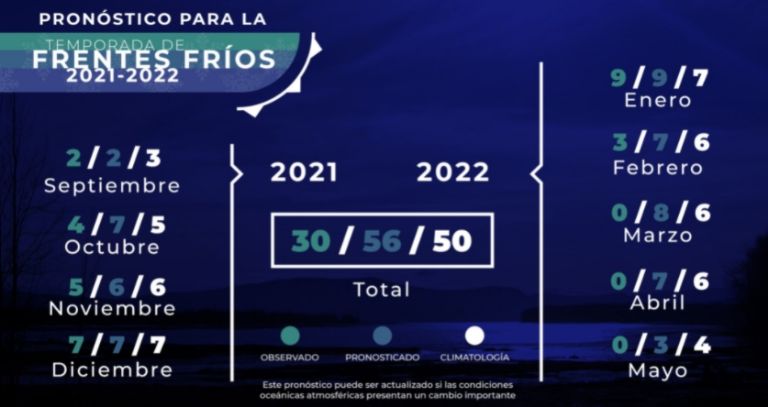 De acuerdo con la página en turno, serán un total de ocho los Frentes Fríos pronosticados en el mes de marzo. Dicho de otras palabras, para este tercer mes del 2022 habrá un Frente Frío más de los que se observaron en febrero, mismos en donde hubo siete pronosticados por tres observados y seis más de climatología.