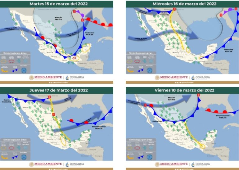 Durante los próximos días de marzo, el Frente Frío recorrerá al noreste, oriente y sureste de México, ocasionando con ello chubascos y lluvias fuertes que estarán acompañadas de granizadas y posible actividad eléctrica con tormentas puntuales en algunos lugares de Chiapas. En adición, la masa de aire frío propiciará rachas de viento al norte y noreste del país.