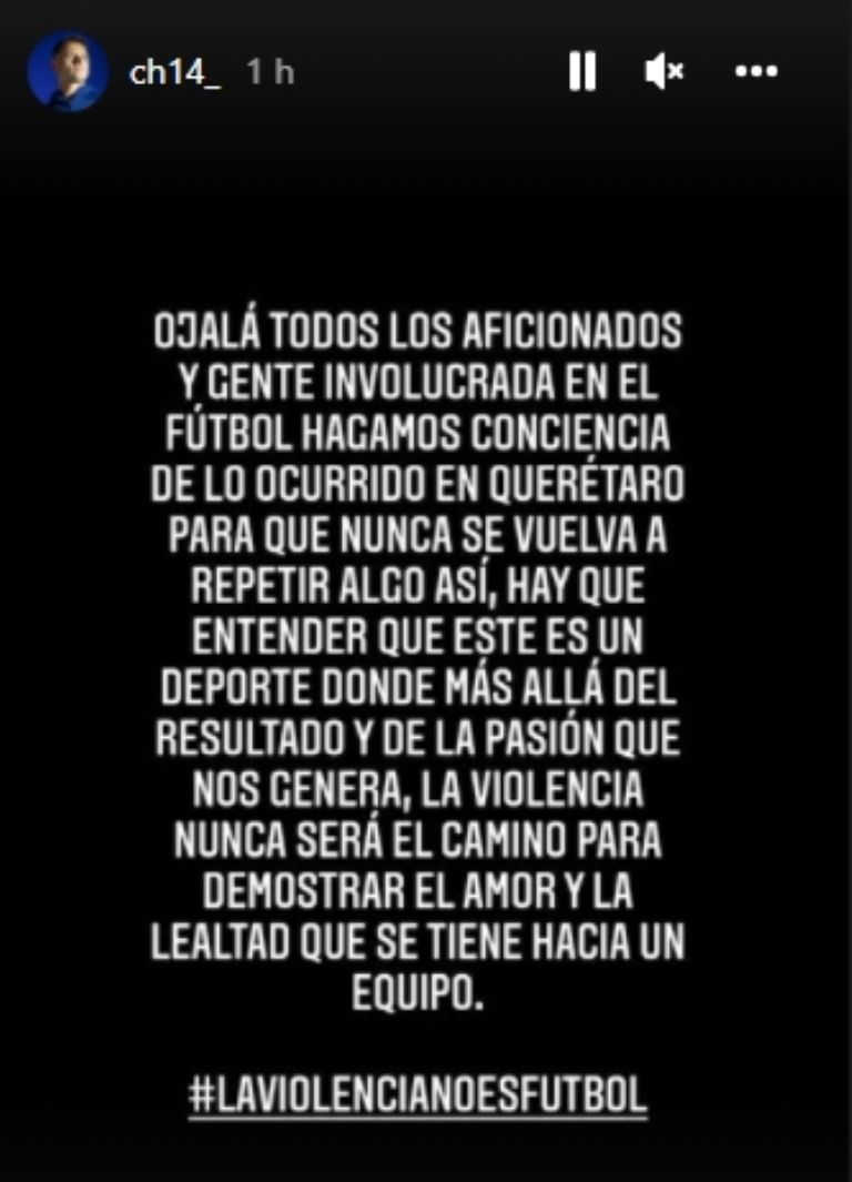 "Ojalá todos los aficionados y gente involucrada en el futbol hagamos conciencia de lo que ocurrió en Querétaro para que nunca vuelva a suceder algo así. Hay que entender que este es un deporte en donde, más allá del resultado y de la pasión que nos genera, la violencia nunca será el camino para demostrar el amor y la lealtad que se tiene hacia un equipo", explicó el Chicharito.