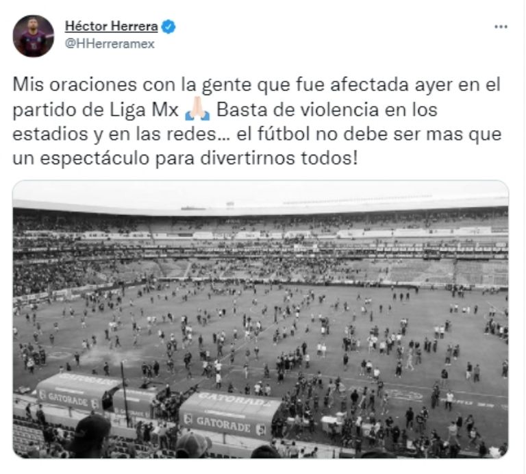 Héctor Herrera, por su parte, utilizó su cuenta de Twitter para realizar un contundente mensaje en el que manda sus oraciones a la gente que resultó afectada y en el que, además, exige el alto a la violencia en la primera división mexicana al asegurar que el futbol, como cualquier otro deporte, debería ser un espectáculo para divertirse.