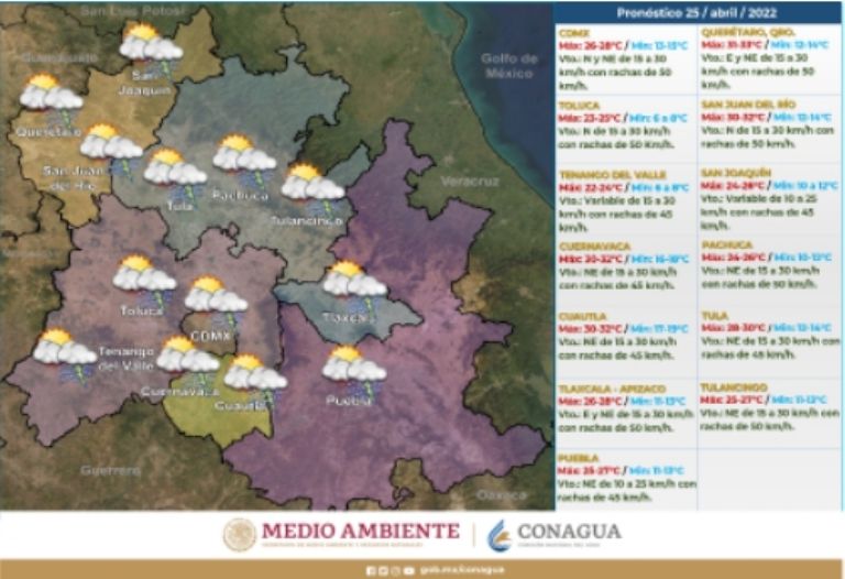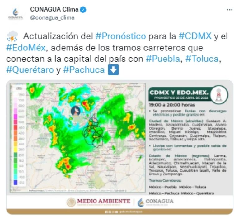 Dicho lo anterior, se pronostica un ambiente templado al amanecer y condiciones de cielo nublado a medio nublado durante la tarde-noche, el cual estará acompañado de chubascos y probabilidad de lluvias puntuales fuertes de 25 a 50 mm en las próximas 24 horas tanto en la CDMX como en el Estado de México, mismas que estarán acompañadas de descargas eléctricas.
