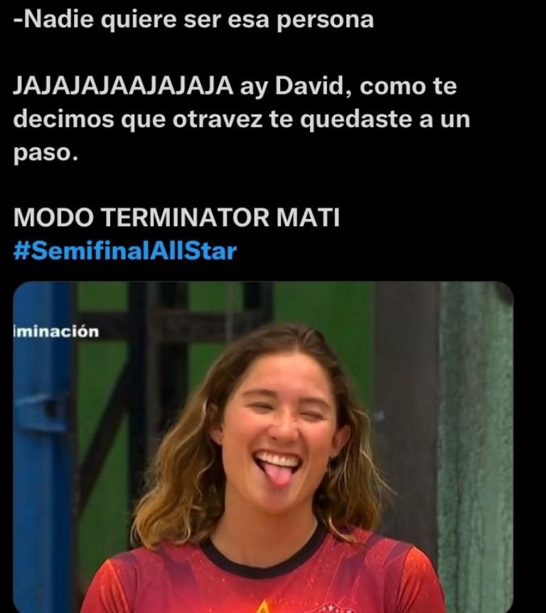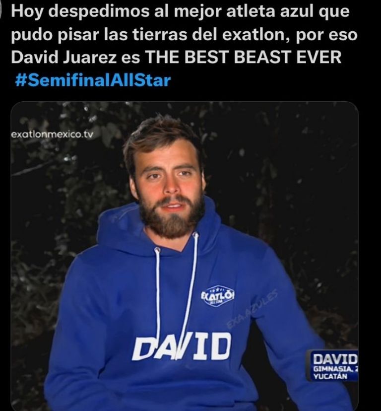 A sólo un día de la Gran Final del Exatlón México All Star, y los memes no perdonan la injusta eliminación de David Juárez, la Besti por una lesión. En el inicio del capitulo del viernes, el gimnasta mostró su felicidad por haber eliminado a Sniper ya que ella estuvo en el Duelo de Eliminación donde salió Big Papi, el mejor amigo del yucateco.