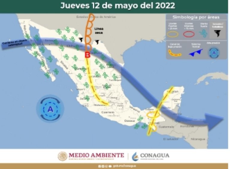 El sistema anticiclónico en niveles medios de la atmósfera mantendrá las temperaturas altas en horarios vespertinos tanto en el norte como en el sureste de la República Mexicana. Sin embargo, lo anterior no exime el hecho de que las sensaciones bajas aparecerán durante la mañana y la noche de este 12 de mayo.