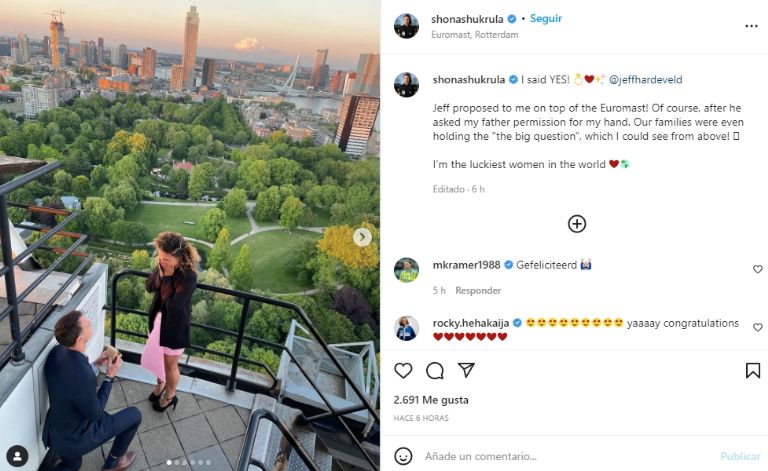 “¡Jeff me propuso matrimonio encima del Euromast! Por supuesto, después de que le pidiera permiso a mi padre para mi mano. ¡Nuestras familias incluso estaban sosteniendo la ‘gran pregunta’, que podía ver desde arriba! Soy la mujer más afortunada del mundo”, escribió Shona en una publicación que, en poco más de siete horas, ya registra más de dos mil 700 Me Gusta.