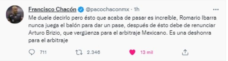 “Me duele decirlo, pero esto que acaba de pasar es increíble. Romario Ibarra nunca juega el balón para dar un pase, después de esto debe de renunciar Arturo Brizio. Qué vergüenza para el arbitraje mexicano. Es una deshonra para el arbitraje”, escribió Paco Chacón en una publicación que, hasta ahora, ya suma más de 12 mil Me Gusta.