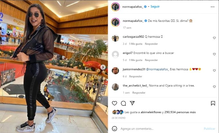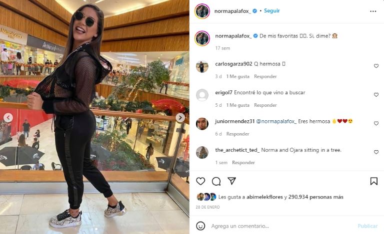 La publicación deriva de dos fotos sumamente parecidas entre sí. En estas, se aprecia a una Norma Palafox con un atuendo completo que asemeja un pans y una chamarra deportiva en tonalidades negras, mismas que son acompañadas por unos tenis cuyos colores principales son el blanco y negro.