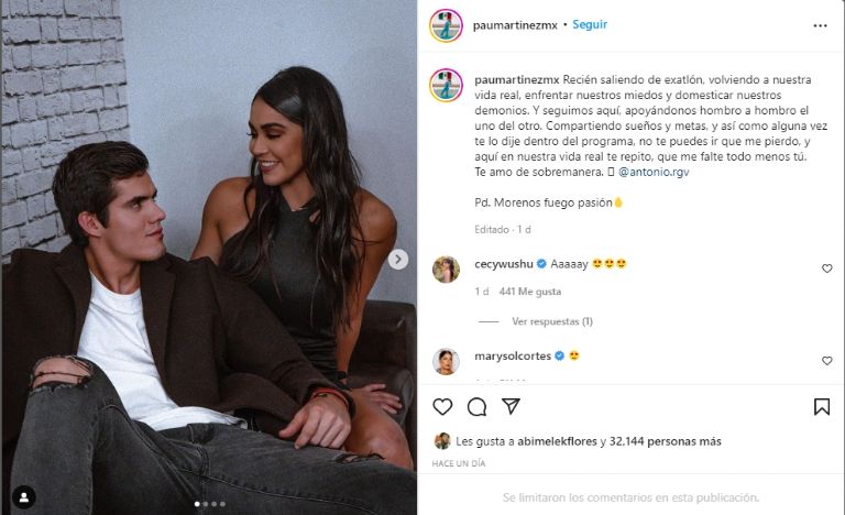 “Recién saliendo de Exatlón México, volviendo a nuestra vida real, enfrentar nuestros miedos y domesticar nuestros demonios. Y seguimos aquí, apoyándonos hombro a hombro el uno del otro. Compartiendo sueños y metas, y así como alguna vez te lo dije dentro del programa, no te puedes ir que me pierdo, y aquí en nuestra vida real te repito, que me falte todo menos tú. Te amo de sobremanera, Antonio.”, escribió Paulina.