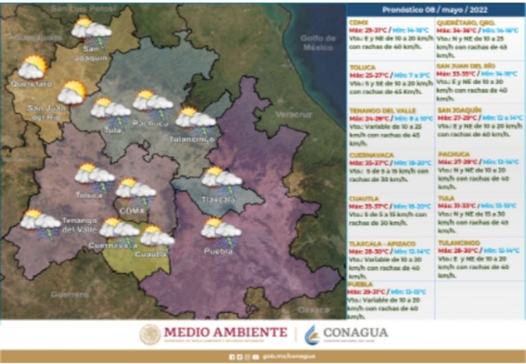 En las horas vespertinas se pronostica un ambiente caluroso; sin embargo, esto ocasionará el incremento de la nubosidad y, por ende, probabilidad de lluvias y chubascos dispersos que van de 5 a 25 mm en la Ciudad de México y el Estado de México, mismos que podrían estar acompañados de descargas eléctricas junto a la posible caída de granizo.