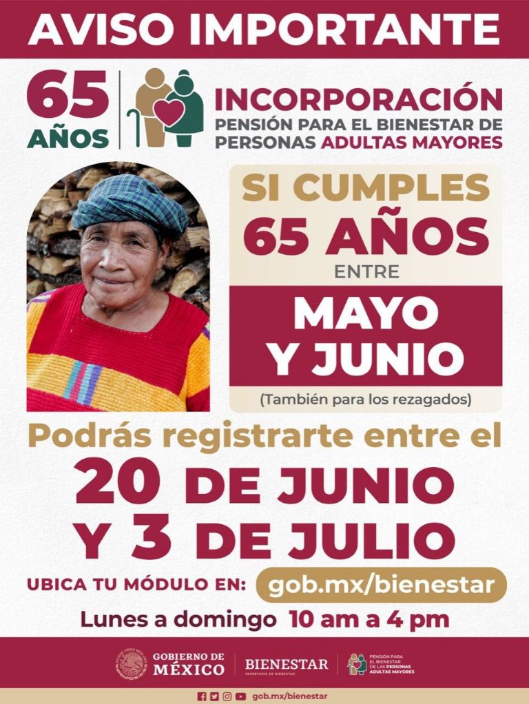 Este mes se abrirán los registros para aquellas personas de la tercera edad que cumplan con los requisitos y que hayan nacido en los meses de mayo y junio. Los interesados tienen del 15 al 30 de junio para comenzar a reunir los requisitos y solicitar la Pensión Bienestar.