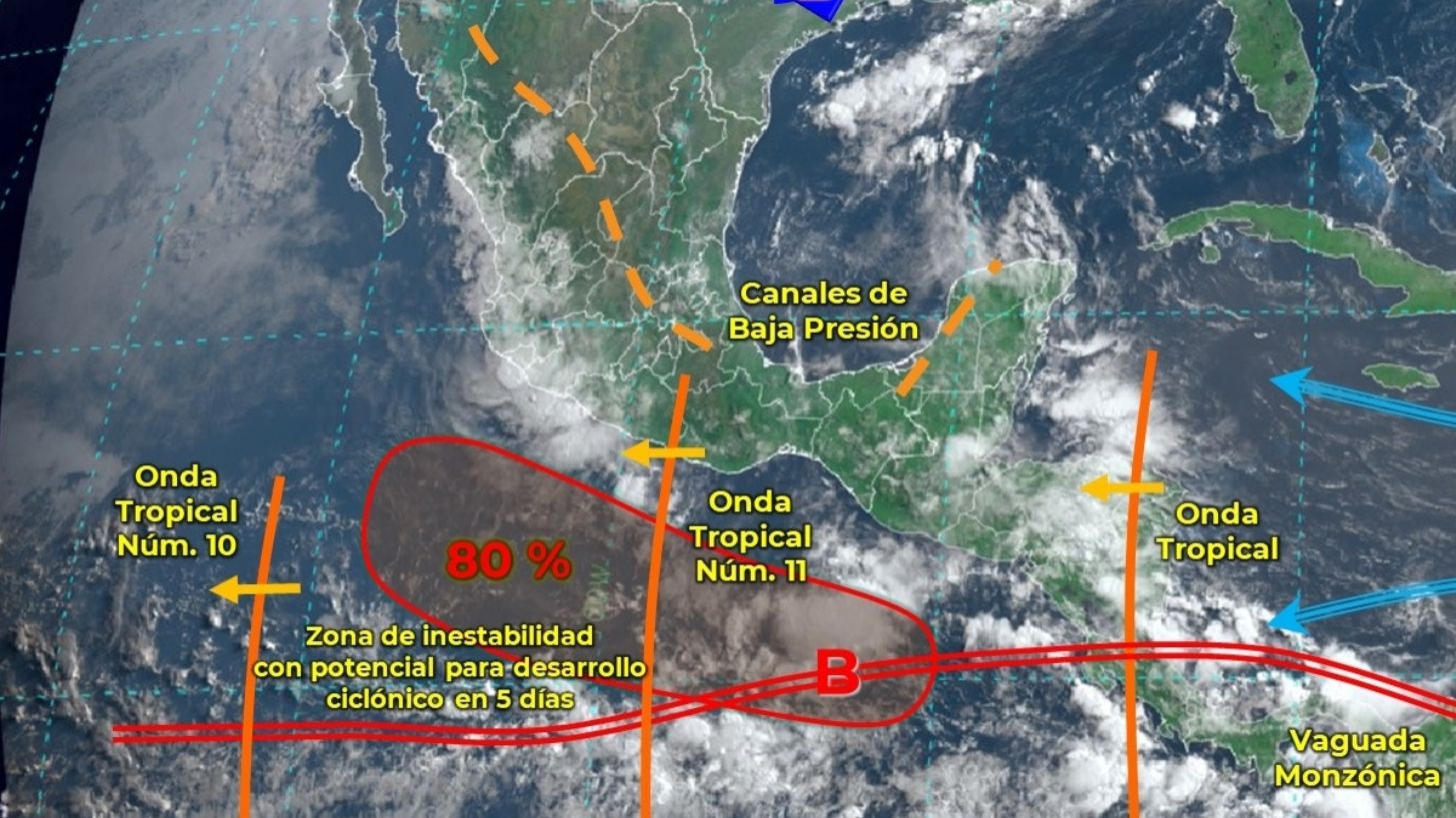 La zona de baja presión con probabilidad de desarrollo ciclónico o posible ciclón tropical se desplazará paralela a las costas del Pacífico mexicano, mientras que la onda tropical 12 recorrerá el sureste y sur del territorio nacional el viernes.