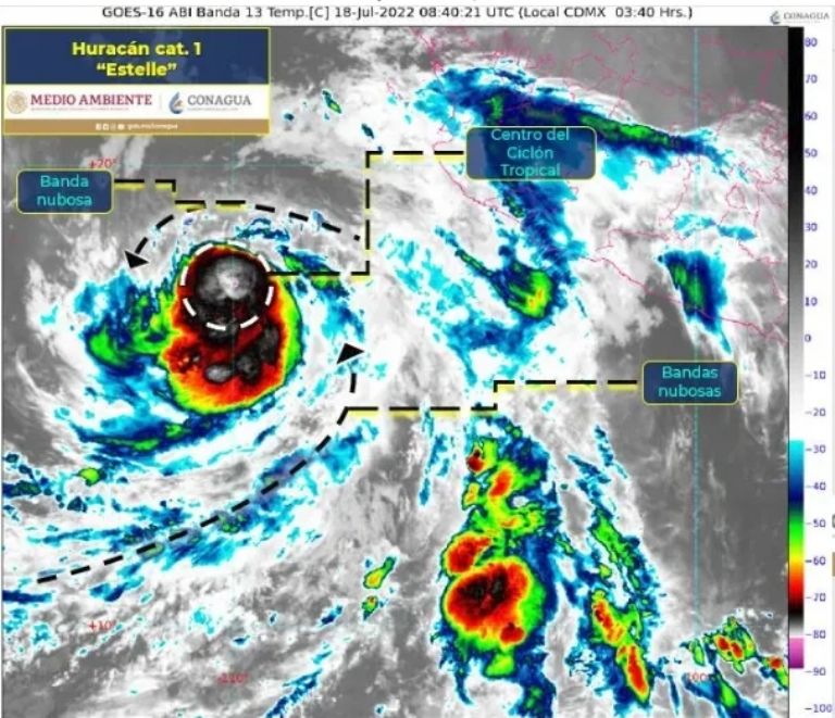 El último reporte presentado por el Gobierno de México establece que el Huracán Estelle se ubica exactamente a 560 kilómetros al sur-oeste de Cabo San Lucas, en el estado de Baja California Sur. De igual forma, se explica que se encuentra a 630 kilómetros al oeste-suroeste de Cabo Corrientes, ubicado en el estado de Jalisco.