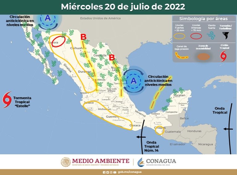 Según las proyecciones del Servicio Metereológico Nacional (SMN) de la Comisión Nacional del Agua (Conagua), esta Onda Tropical afectará al territorio nacional desde este martes hasta el próximo sábado, aunque bajando de intensidad porque poco a poco se irá degradando, desde el Atlántico hasta el Pacífico.