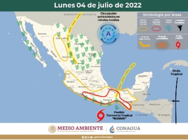 De acuerdo con información del Gobierno de México y de la Comisión Nacional del Agua, los estados mostrados a continuación serán considerablemente afectados por las lluvias derivadas del Ciclón Tropical Bonnie a lo largo de hoy lunes 4 de julio del 2022, por lo que se recomienda el uso de paraguas para evitar enfermedades respiratorias.