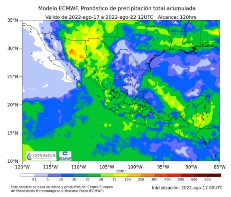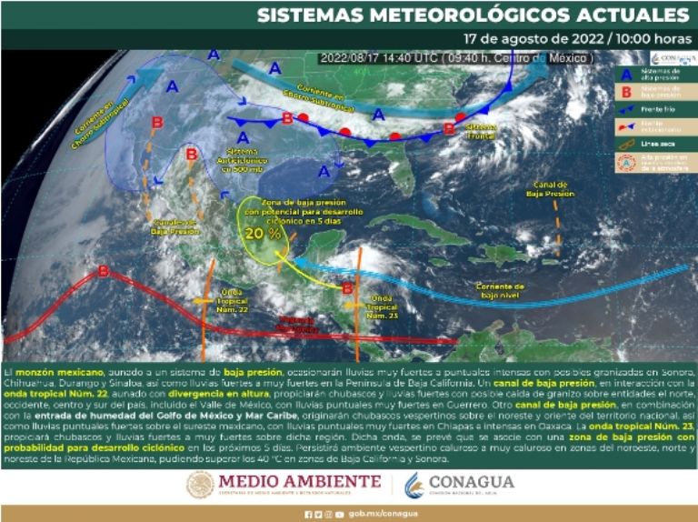 Bajo esta panorámica, será durante el viernes 19 y el sábado 20 de agosto que la zona de baja presión se desplace nuevamente hacia el occidente del Golfo, lo cual podría producir lluvias fuertes e intensas en el noreste, sureste y oriente del país a través de puntuales intensas en estados tales como Puebla, San Luis Potosí, Tamaulipas y Veracruz.